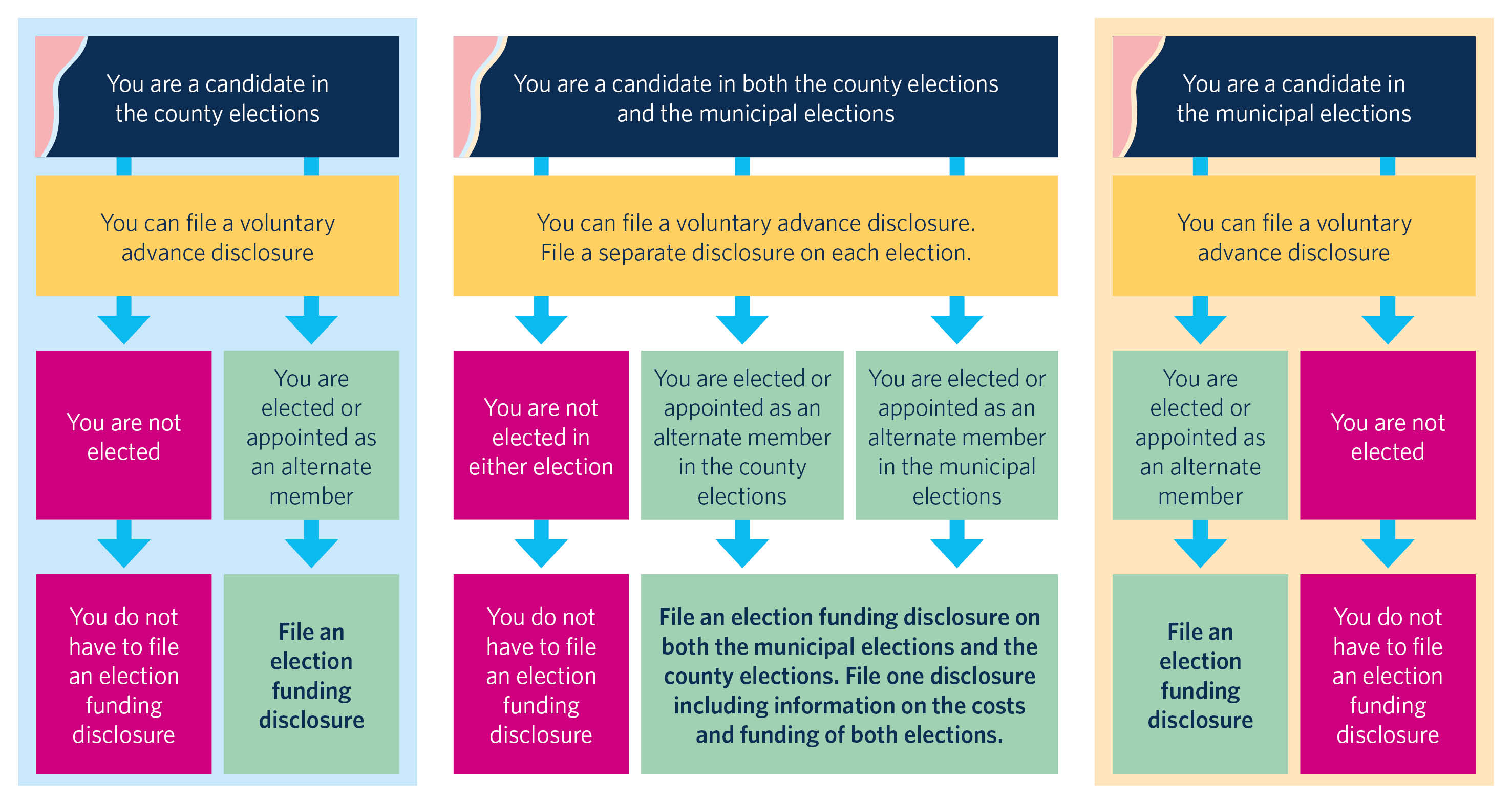 The candidates who have been standing in both the county and the municipal elections at the same time and that are subject to the disclosure obligation should file one election funding disclosure to disclose the costs and funding of their county and municipal election campaigns.