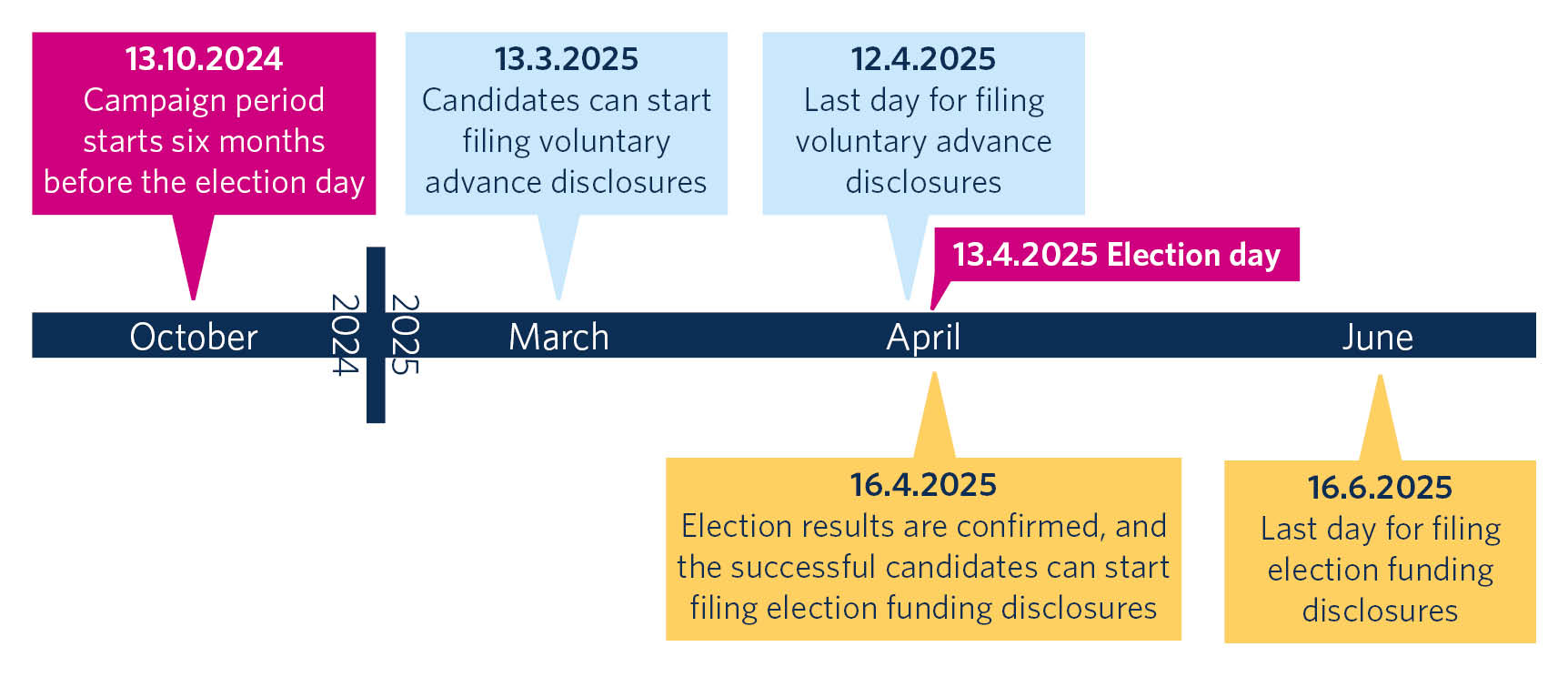 In the election funding disclosure, the candidate discloses both the election campaign costs for the campaign period and the funding to cover the costs. The campaign period of the 2025 county and municipal elections starts on 13 October 2024 and ends on 27 April 2025.