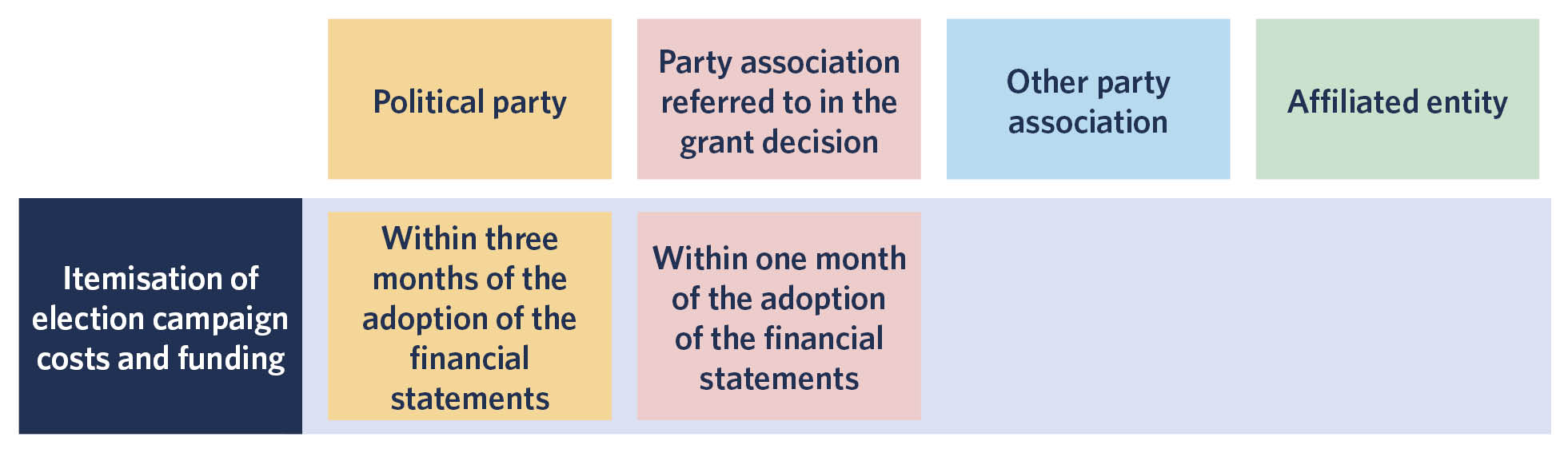 A political party shall submit an itemisation of its election campaign costs and funding within three months of the adoption of the financial statements. The information shall be submitted in connection with the financial statements covering the time of the elections. Thus, an itemisation of election campaign costs and funding related to the 2023 parliamentary elections, for example, shall be submitted in connection with the financial statements for 2023.