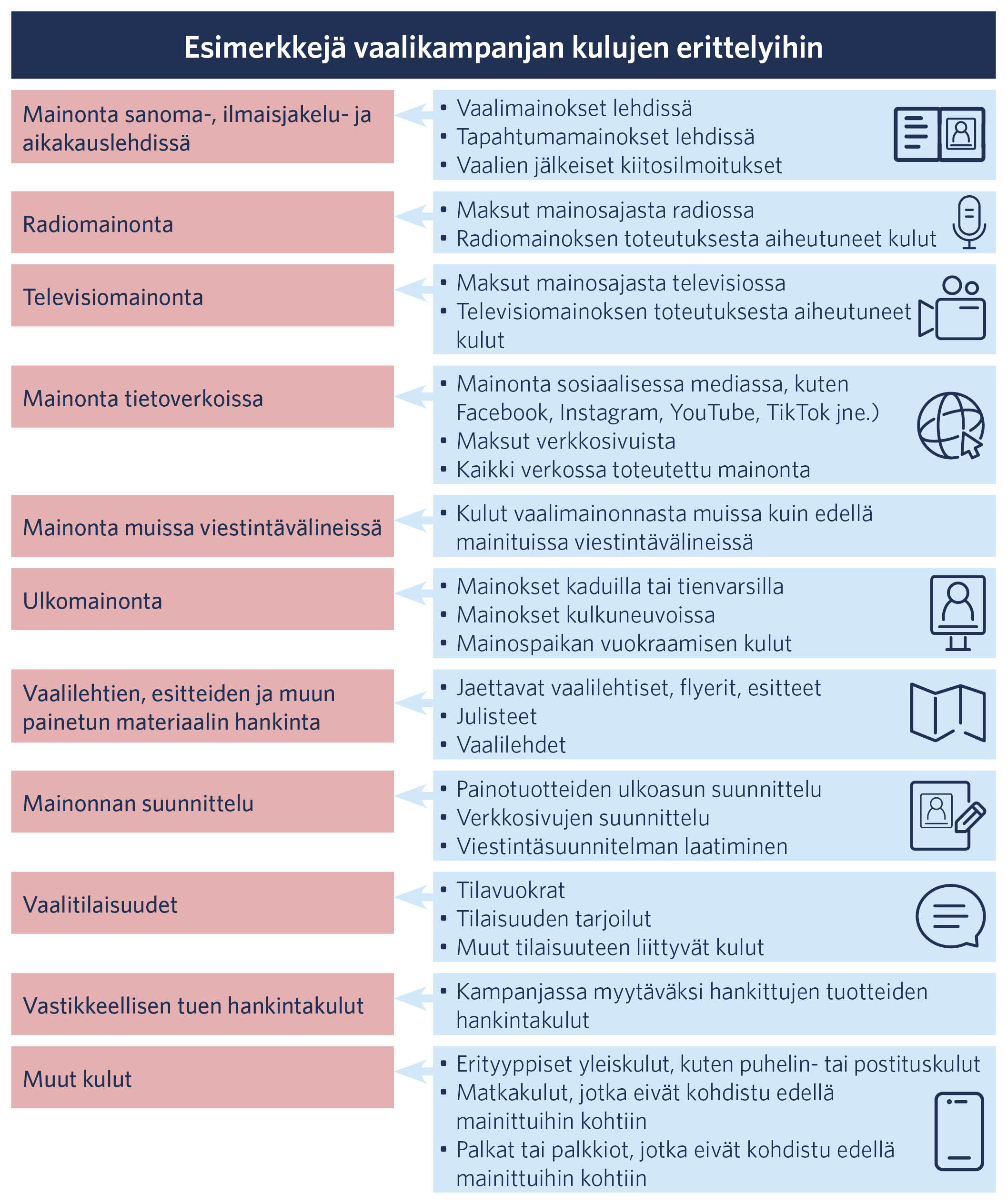 Vaalimainonnan kulut eritellään lehti-, radio- ja televisiomainontaan, tietoverkossa ja muissa viestintävälineissä toteutettuun mainontaan, ulkomainontaan sekä vaalilehtien, esitteiden ja muun painetun materiaalin hankintaan.