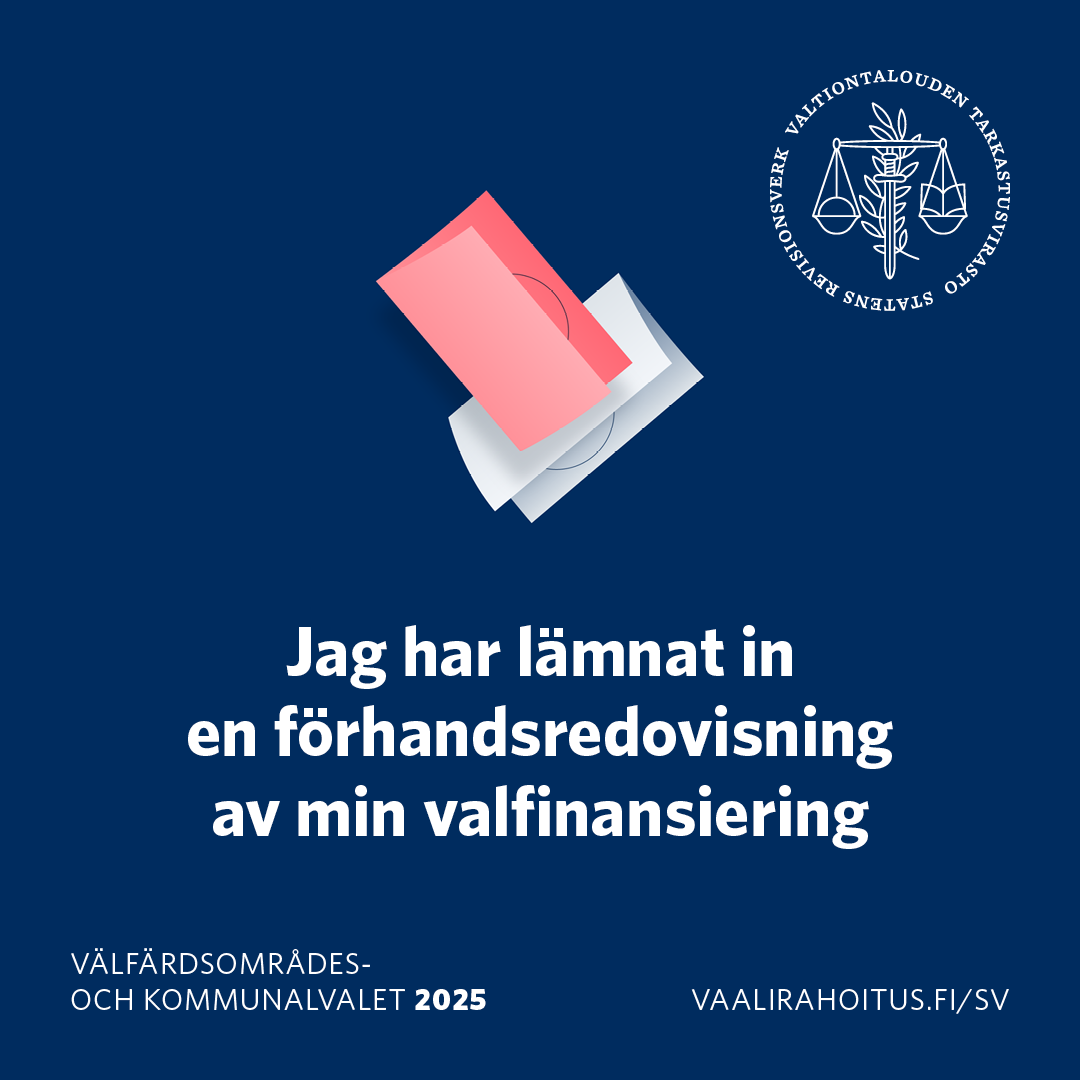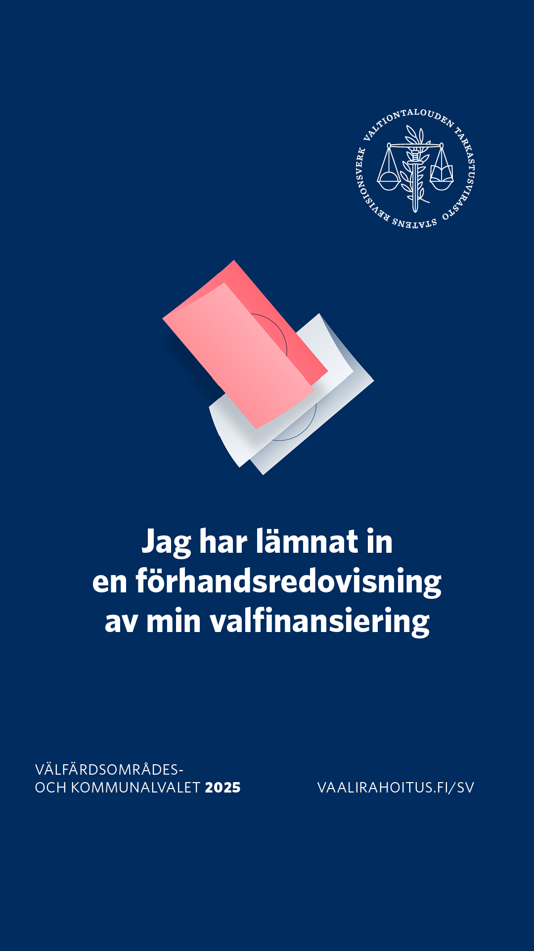 Förhandsredovisningen av valfinansieringen vid välfärdsområdes- och kommunalvalet kan lämnas in under perioden 13.3–12.4.2025. Redovisningen innehåller en plan för valfinansieringen och kostnaderna för valkampanjen. En kandidat som är uppställd i både välfärdsområdesvalet och kommunalvalet ska lämna in en separat förhandsredovisning för båda valen.