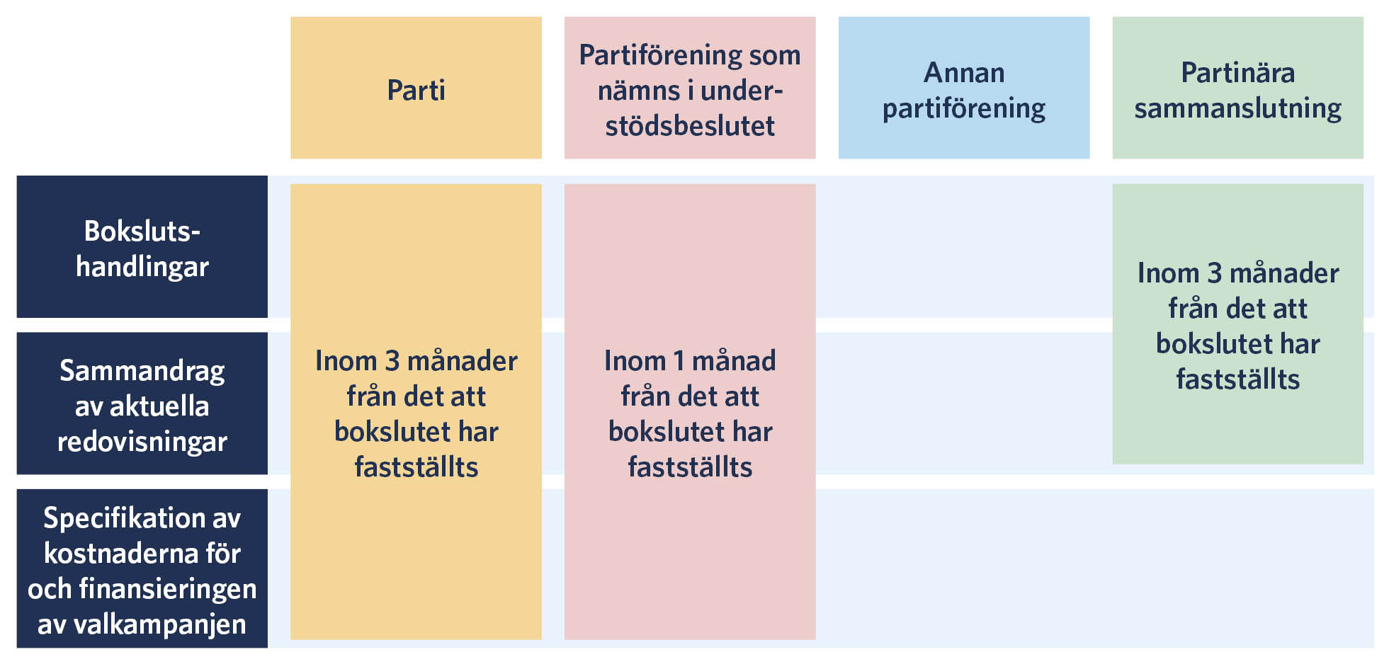 Partiet och den partinära sammanslutningen ska lämna bokslutshandlingarna till Statens revisionsverk inom tre månader från det att partiets bokslut har fastställts. Föreningar som avses i understödsbeslutet ska lämna in bokslutshandlingarna till Statens revisionsverk inom en månad efter att föreningens bokslut har fastställts.