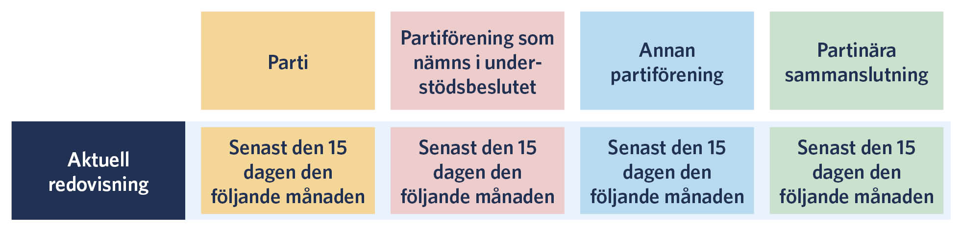 Den aktuella redovisningen av bidraget ska lämnas in senast den 15 dagen i den kalendermånad som följer efter mottagandet av bidraget. Redovisningar som lämnas in efter detta datum mottas och publiceras som försenat anlända. De aktuella redovisningarna lämnas via Statens revisionsverks e-tjänst.